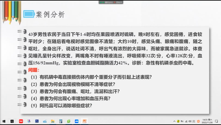 本次公开课主要围绕“神经元之间的功能联系”展开。(1)课前准备阶段:①员工自主利用课余时间在学习通上观看教学视频并进行章节训练;②分小组认领案例分析任务,并制作PPT。(2)课堂阶段:席丽老师首先对本小节的重难点内容进行精讲、细讲;其次对章节训练中错误率高的题目进行详细讲解,使员工不仅做到“知其然”,还要做到“知其所以然”;随后,由任务认领小组对“农民喷施有机磷农药导致中毒后,出现毒蕈碱样症状、烟碱样症状及临床使用阿托品进行解毒”这一案例进行分析和讨论;最后席丽老师对各小组分析过程和讨论结果进行补充和评价。通过以员工为主导,以重难点精讲+案例分析为主要教学方法,使员工掌握各知识点之间的内在联系,并学会用已学的知识解决新的问题,从而提高运用知识的能力。