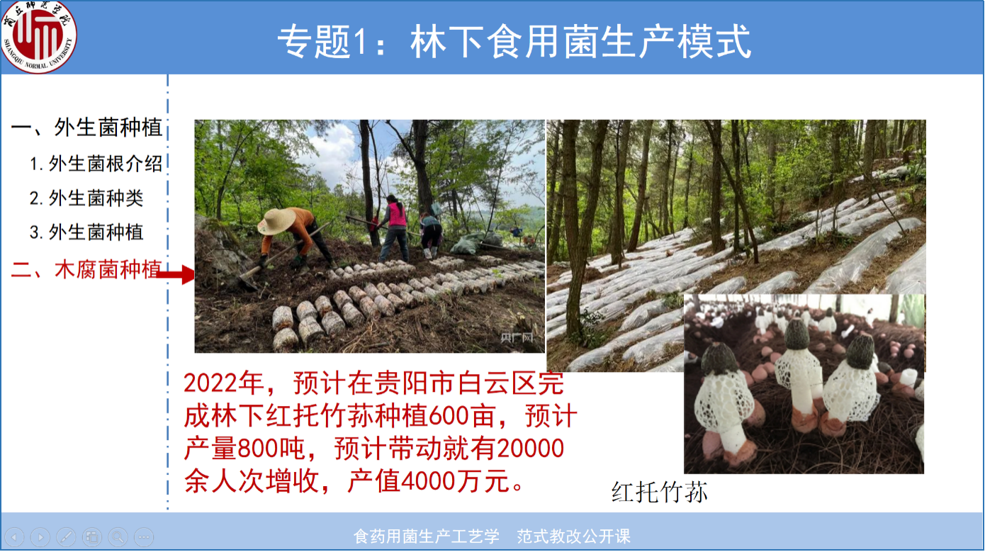 本节课围绕林下食用菌生产模式,首先进行了所认识的珍稀食用菌课堂讨论,学习了共生外生菌,如块菌、松茸、牛肝菌、红菇等珍稀食用菌的生物学特性、营养价值和药用价值,重点学习了林下松茸和块菌栽培模式的研究和实践现状。课堂引入野生菌市场情况新闻及野生菌采集等视频,教学内容丰富,课堂气氛活跃,员工积极参与课堂活动,踊跃回答问题。