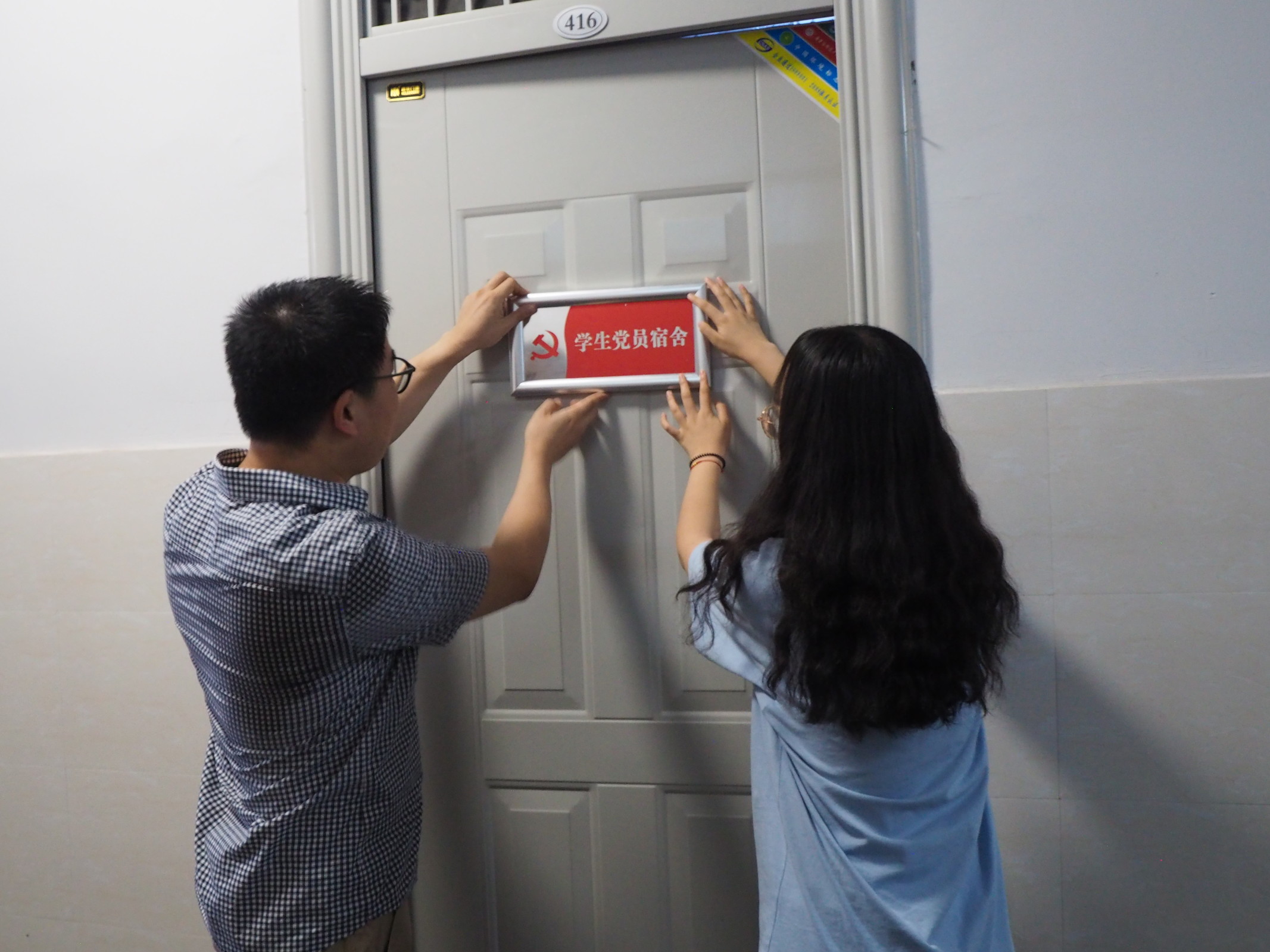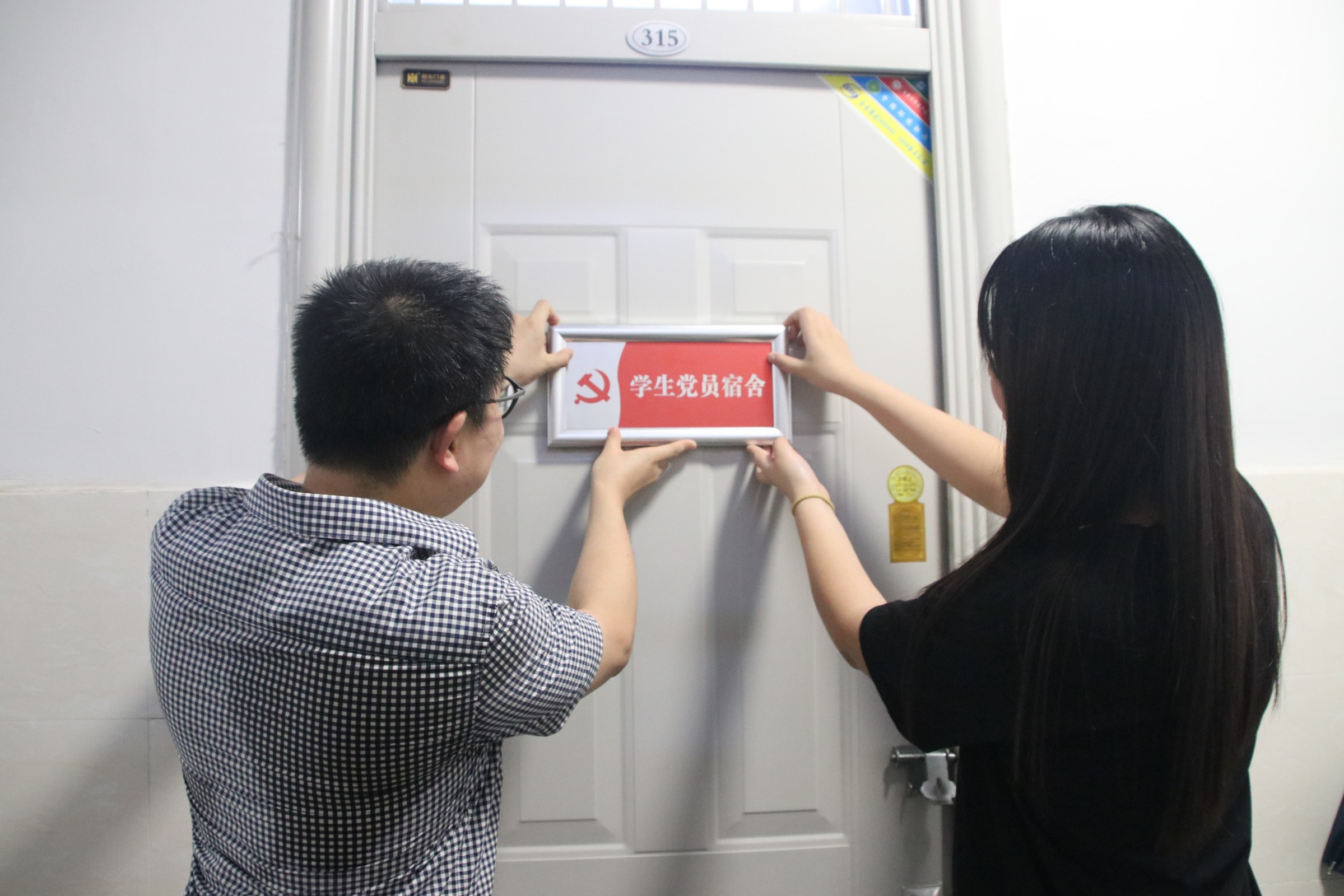 挂牌过程中,老师们一同走进员工宿舍,与员工进行深入交流。朱震杰强调,党员宿舍挂牌是一种荣誉,更是一种责任,希望员工党员充分发挥“一间党员宿舍、一座先锋堡垒”的引领作用,为实现员工党建进宿舍,优化公司员工健康成才的宿舍环境而努力。陈东鹏介绍了党员挂牌活动的初衷,要求党员们时刻牢记党的宗旨,增强党员意识,在日常生活中以身作则,发挥先锋模范作用。宋艳军和张美芸共同询问了员工们学习和生活上的情况,在期末来临之际,希望党员员工们能带动同学形成温馨和谐、共同奋进的宿舍氛围。员工党员纷纷表示寝室挂牌活动,强化了党员身份的认同感,能够时刻提醒自己在平时生活中要注意言行做好表率、树立旗帜。