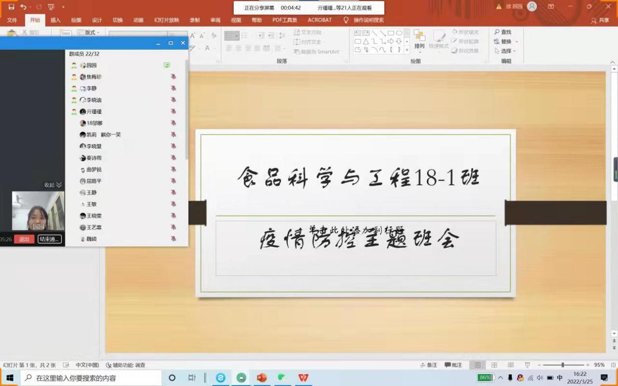 为了进一步落实好beats365中文官网疫情防控工作,使同学们对当前疫情形势有深刻的了解,切实提高同学们的安全意识,帮助同学们更好地掌握疫情防控知识,beats365中文官网2018级食品科学与工程专业1班班主任徐园园于2022年3月25日召开疫情防控主题班会。