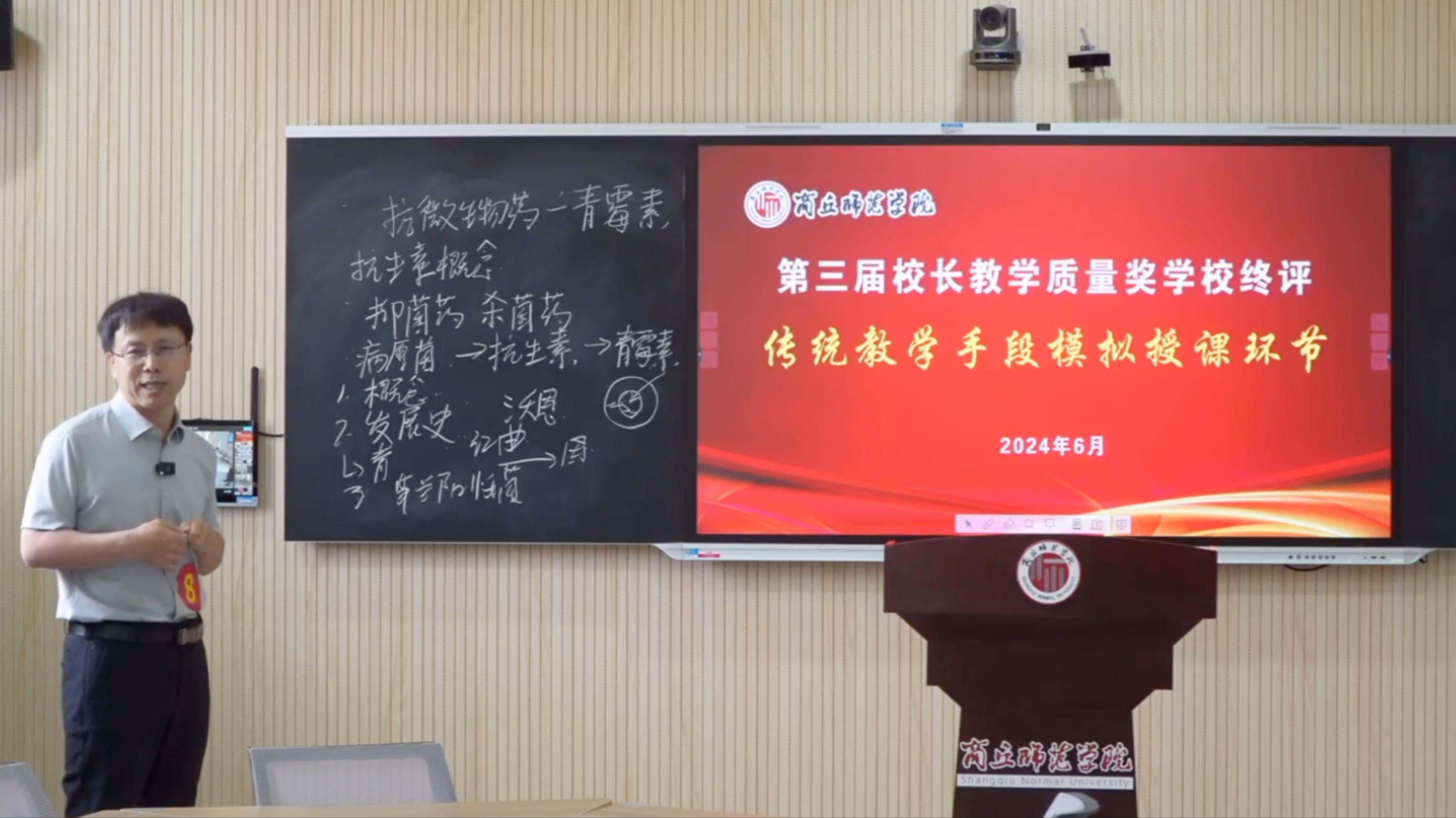 决赛阶段包括现代化教学手段授课和传统教学手段授课两个环节。在现代化教学手段授课环节(占总分的40%),面对抽取到《传出神经递质——肾上腺素》章节,周庆峰教授采用案例导入法和分组讨论法,逐步讲授了肾上腺素的来源、药理作用、临床应用和不良反应,内容衔接紧密,员工互动热烈,取得了良好的授课效果。在传统教学手段授课环节(占总分的40%),周庆峰教授抽取的是《抗微生物药——青霉素》章节,他采用板书教学,从青霉素概念、发展史、作用机理等方面展开详细的详解。讲解过程中,周庆峰抓住青霉素有关的重难知识点,有机融入课程思政教学知识点,同时积极开展教学互动和典型案例分析,展现了公司教师扎实的创新性教学能力。