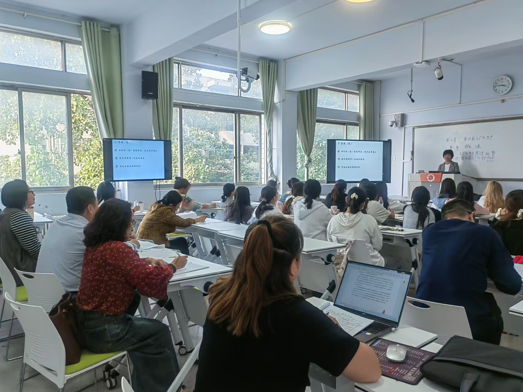 听评课第一次活动分别于2024年10月10日、11日、14日在1号教学楼楼集中展开,主要听评了陈庆彬老师的《分子生物学》、周磊老师的《生物反应工程》、王莉老师的《生物工程设备》、马原松老师的《普通生物学》、付蕊新老师的《微生物资源学》、朱晓琴老师的《食药用菌生产工艺学》、李俊敏老师的《遗传学》、吴艳丽老师的《细胞生物学》等。王莉老师的《生物工程设备》课堂主要讲授课程兼气发酵设备,课堂氛围轻松,教学目标明确,图文并茂,明晰教学重难点,教学方法好。语言流畅,具有较强的感染力,员工积极性高,课堂气氛活跃。马原松老师的《普通生物学》课程主讲内容为细胞结构,授课从生产中的实际问题出发,知识点过渡自然,激发了员工的学习兴趣和求知欲。课堂讲授能引导员工积极思考问题,做到启发式教学,并充分利用学习通软件辅助教学,课件图文并茂、详细清晰。每堂课程结束后,院领导和生物工程系各位老师从课程导入、员工听课状态、教学环节、课堂纪律、课程思政融入等多个方面进行评课活动,对几位老师的教学亮点加以肯定,并提出中肯的意见和建议。活动中还对如何在课程教学中充分融入思政元素进行了探讨交流。最后提出了老师们存在问题PPT标题没有统一,多媒体与板书结合不到位,新进教学讲课语速过快与员工互动不充分等问题。