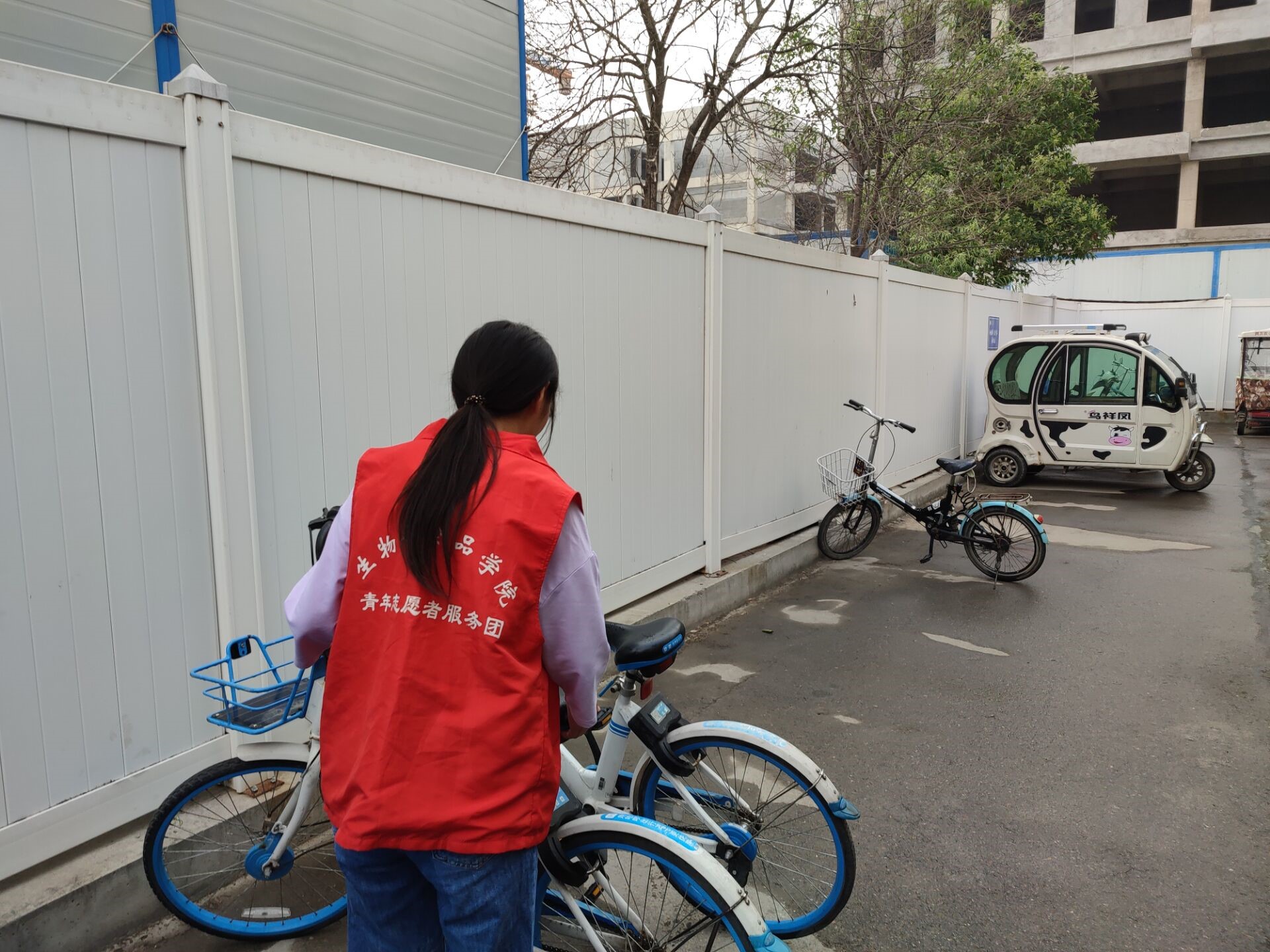活动伊始,志愿者将违规停放的共享单车挪动到指定的停放点,并将共享单车排列整齐,为行人腾出相应的空间自由通行。接着,志愿者对单车上的灰尘和雨后的水渍进行擦拭,保证座位的洁净,以方便员工使用。最后,志愿者将路面垃圾打扫干净。整个活动过程中,志愿者齐心协力,互帮互助,一同完成了任务,打造出更加整洁的校园。