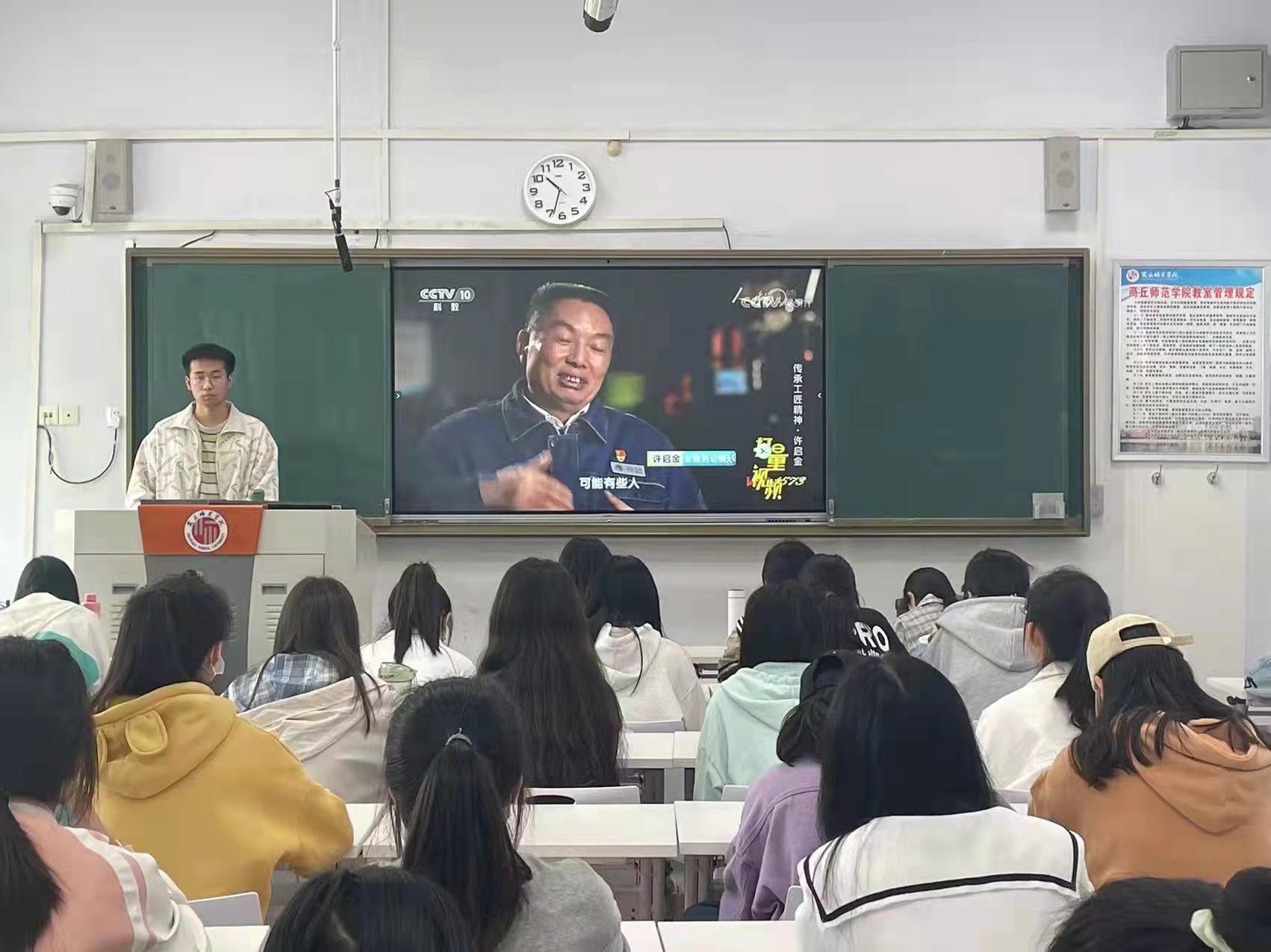 首先,各班班长给同学们播放了许启金的相关视频,向同学们传达了青春无悔,志在千里;志存高远,劳动不已的重要思想。然后,各班班长向同学们传达了许启金自身的崇高品质,例如伟大的劳动精神、奋斗精神。