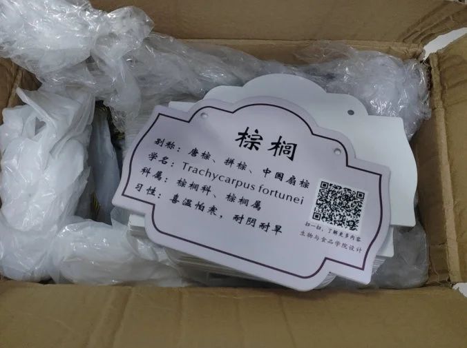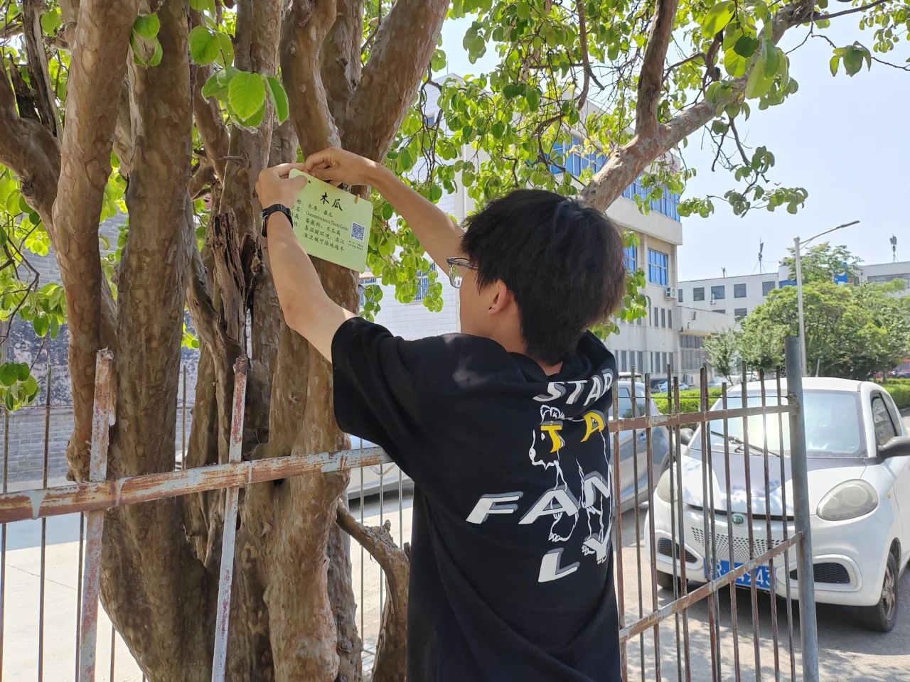 同学们在杨杰老师的指导下,利用课余时间,对校园植物实地调查、分类统计,仔细鉴别校园植物种类。由公司团委新闻中心对各种植物铭牌进行设计制作和悬挂,植物铭牌上附有植物的名称、科属、特征等信息,同时印制着二维码,通过扫描二维码即可获得更加详细全面的植物介绍。