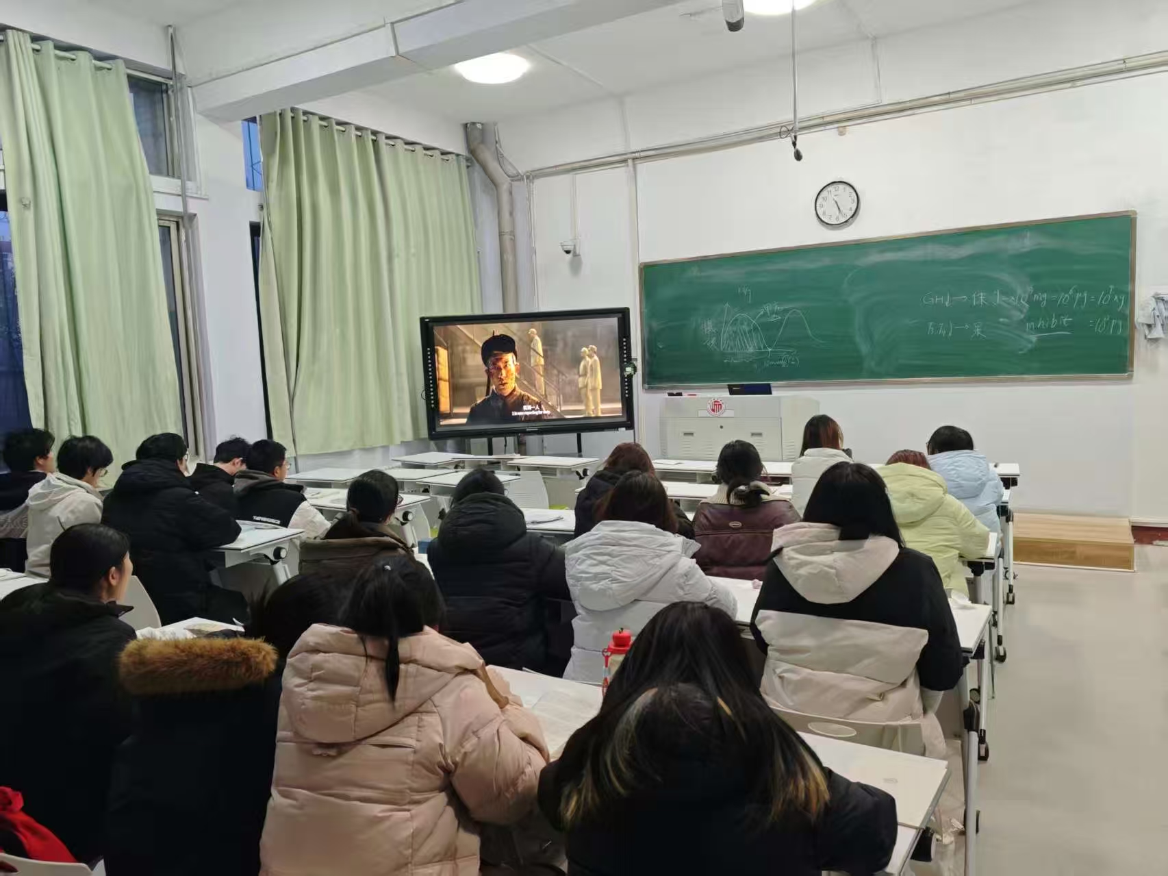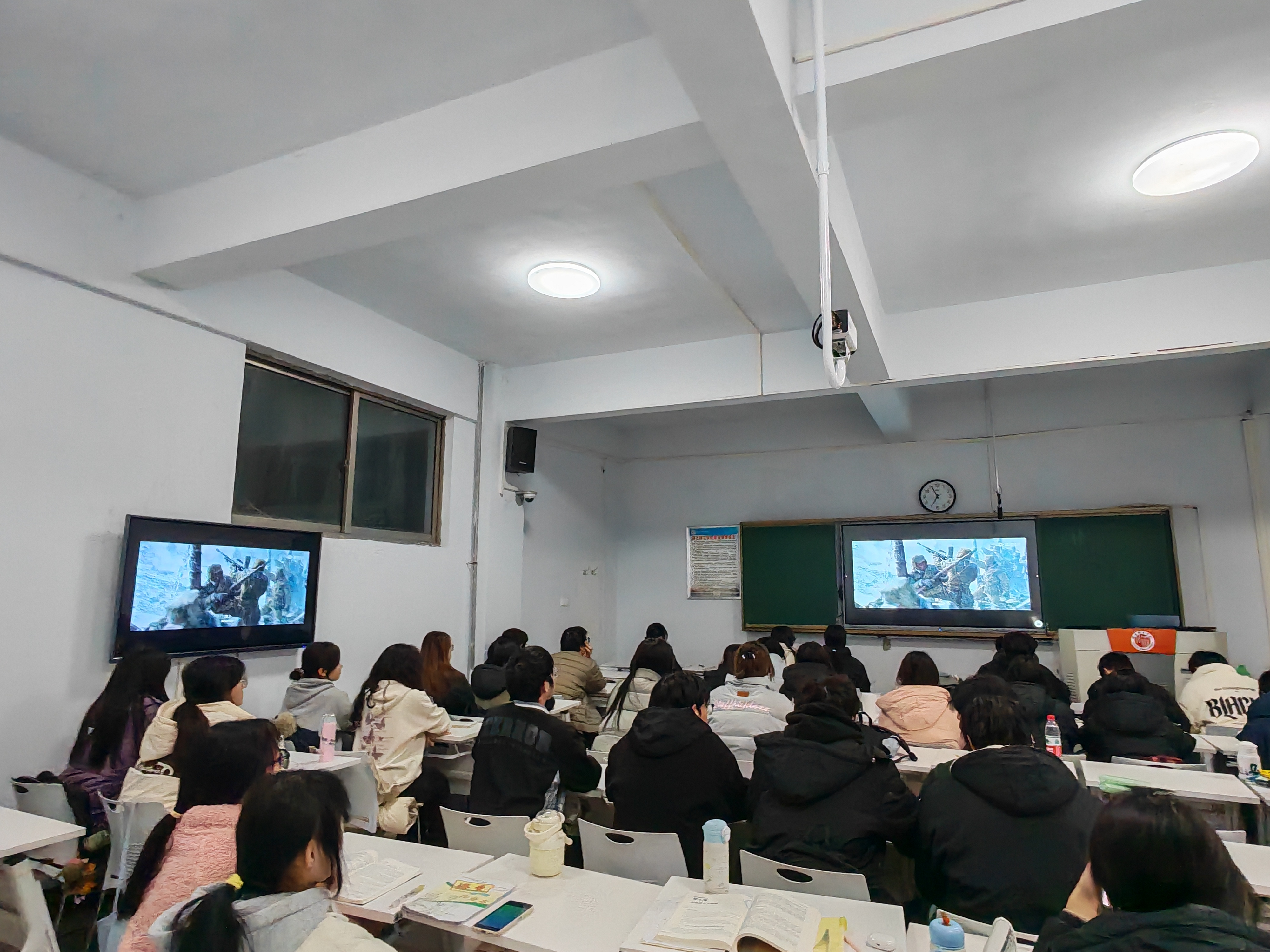 12月24日晚,公司组织低年级在自习教室集中观看、高年级在宿舍观看的方式,一起观看电影《长津湖》和《长津湖之水门桥》。影片以长津湖战役为背景,以“穿插连”的战斗历程为主线,将志愿军战士的家国情怀与英雄壮举生动呈现在电影之中。