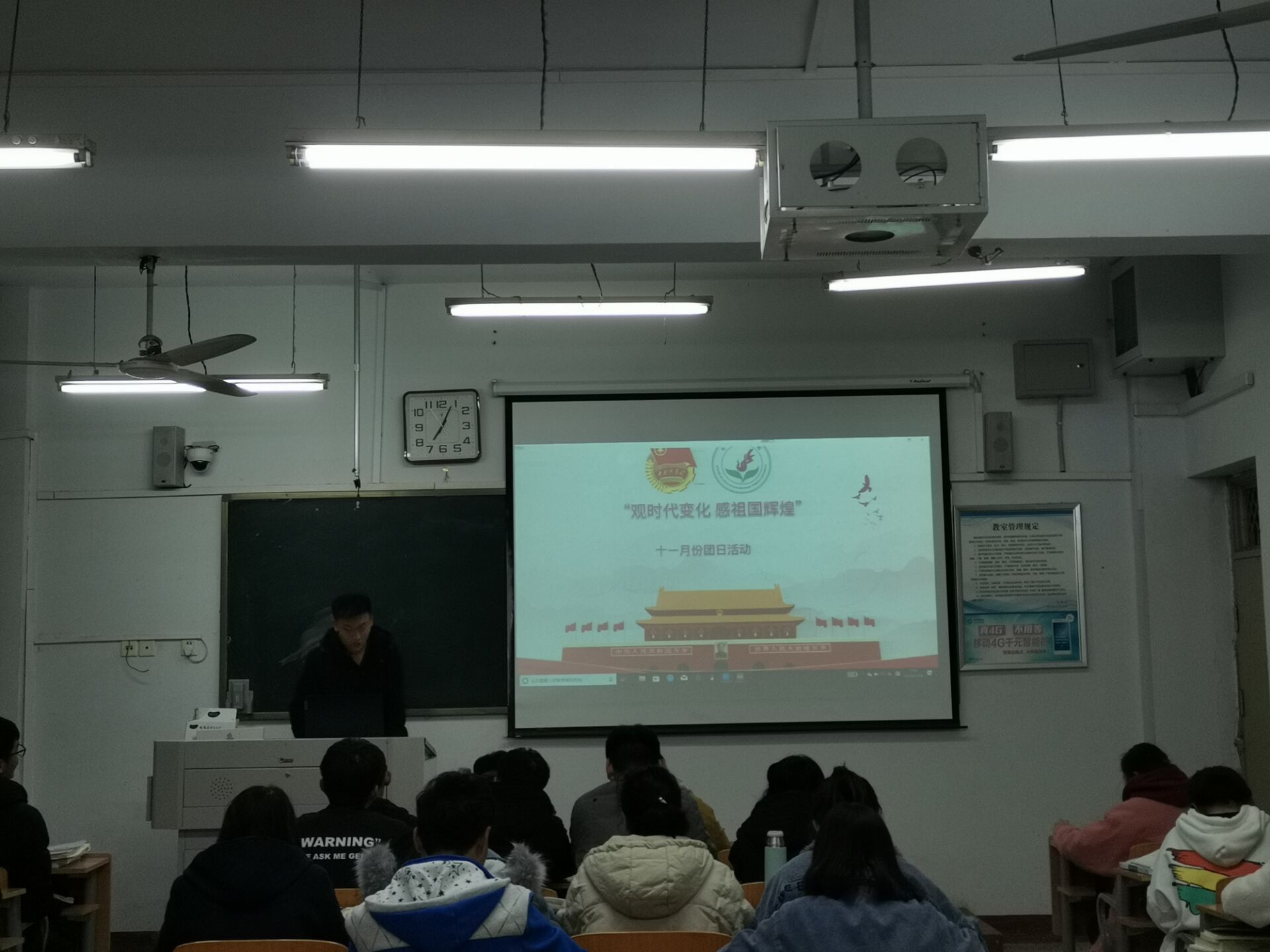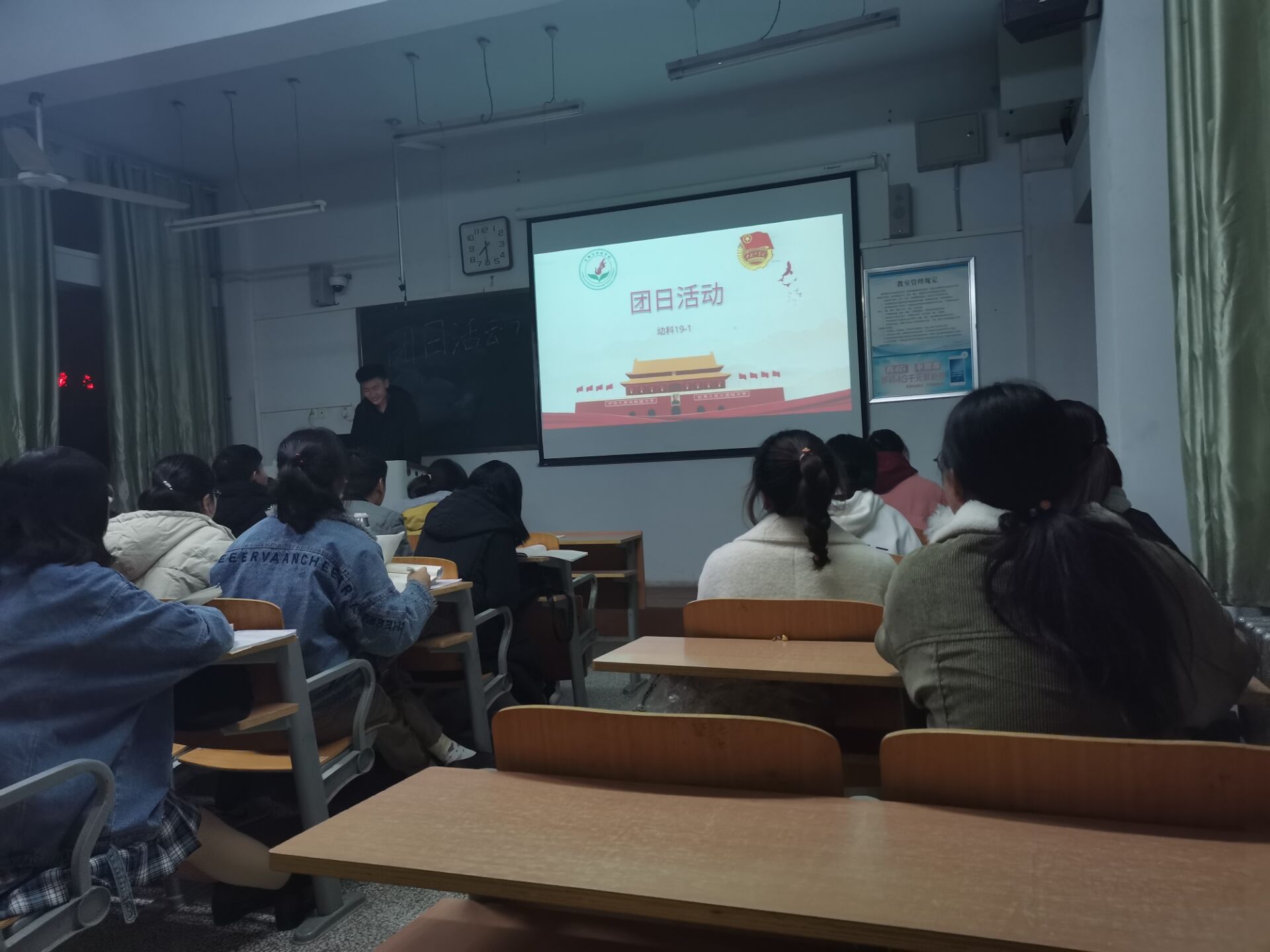 为推进“观时代变化 感祖国辉煌” 主题教育活动,动物科学19-1班员工于11月28日晚在一号楼510教室开展相关主题团日活动。
