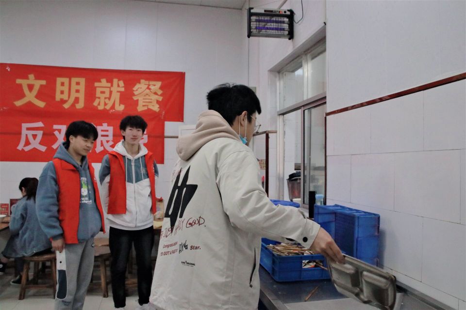 本次活动由志愿者们轮流值班,在规定时间内到食堂进行监督和引导。在活动整个过程中,每名志愿者都表现得很好。志愿者们认真服务、文明劝导,面带微笑用温馨的话语提醒在食堂就餐的同学们自觉把餐具放到回收处,同学们一个接一个地把餐具放到餐具回收处的行为充分展现了当代老员工的良好素质。同时,同学们良好的文明习惯也给食堂的工作人员减轻了许多负担。