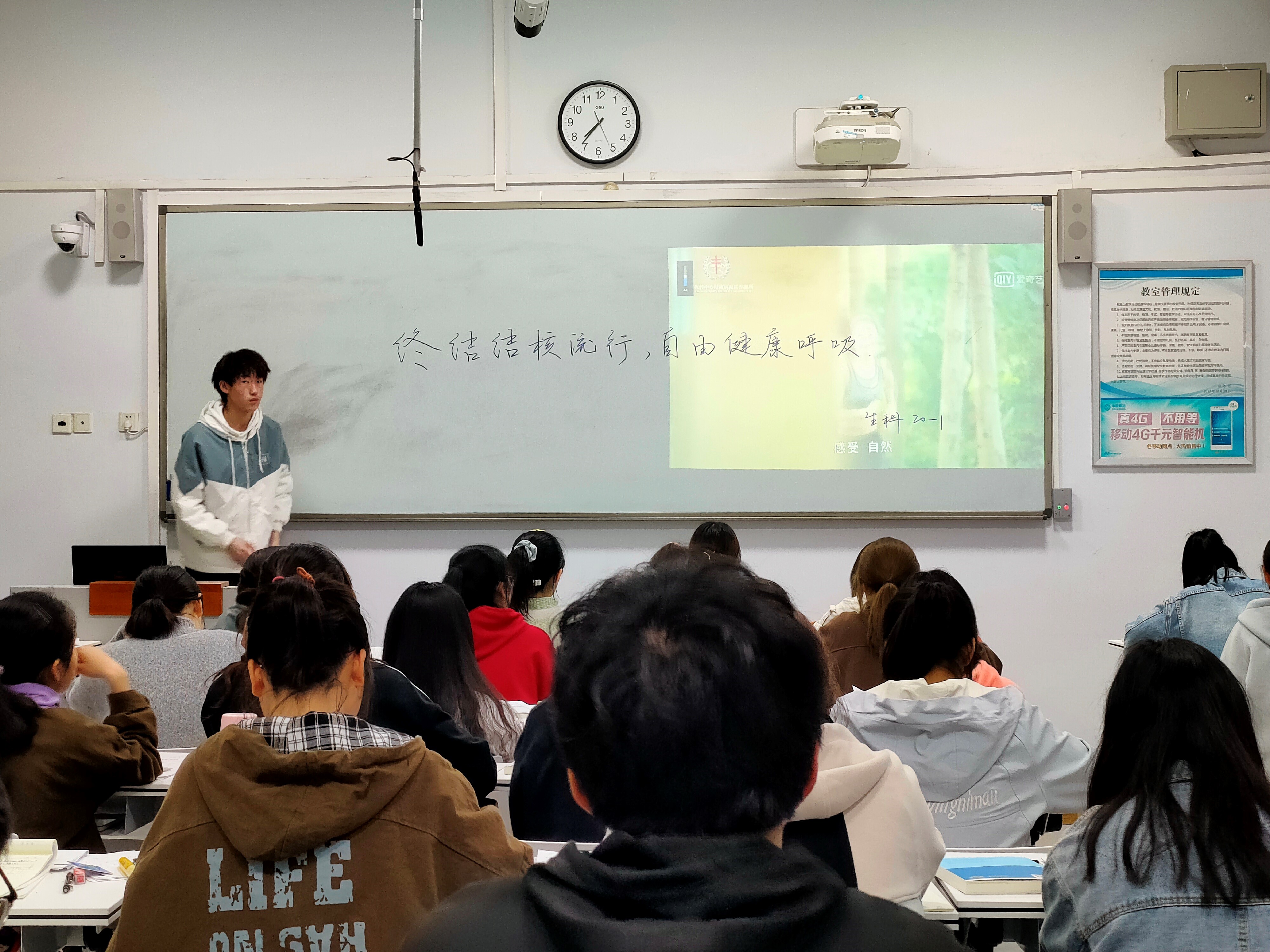 首先有同学上台介绍了结核的致病机理,症状,传播途径。结核是由结核杆菌感染引起的疾病,结核杆菌感染之后会造成全身感染,最常见的就是呼吸系统感染也就是肺结核。人与人之间呼吸道传播是本病传染的主要方式。传染源是接触排菌的肺结核患者。随着环境污染和艾滋病的传播,结核病发病率越发强烈。除少数发病急促外,临床上多呈慢性过程。常有低热、乏力等全身症状和咳嗽、咯血等呼吸系统表现。随后团支书为大家播放了有关视频,同学们认真观看,感受深切。