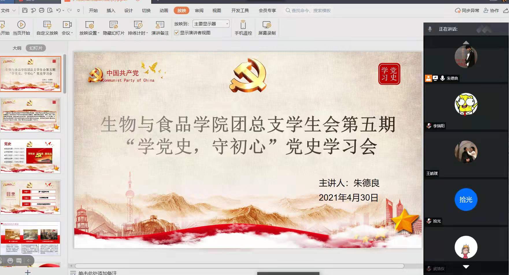 为进一步加强党史学习教育,统筹推进党的作风纪律和制度建设,2021年4月30日,beats365中文官网团总支员工会于线上开展第五期“学党史,守初心”党史学习会。此次会议由公司团总支员工会主席朱德良主持,团总支员工会全体成员均参加了此次会议。