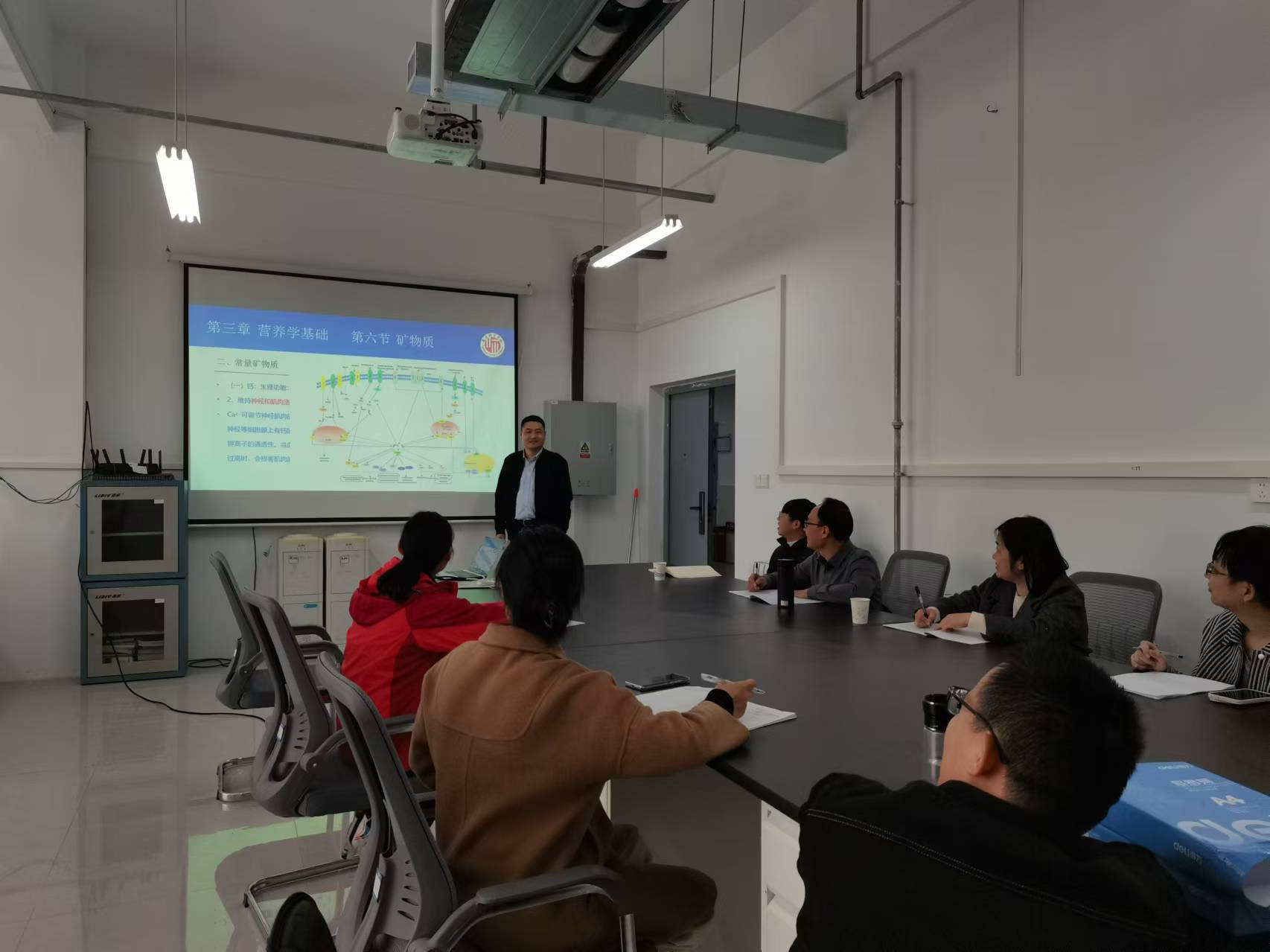 宋旸老师11-12周将进行的《食品营养学》第3章第6节“矿物质”章节的授课内容进行集体磨课。首先,宋旸老师展示了接下来两周的教学环节,包括基于学习通的线上预习环节(观看知识点教学视频及讨论课前问题);课中以问题导入(“中国人普遍用铁锅炒菜,为什么还有那么多人患缺铁性贫血?”以及“加碘盐有没有必要吃?”等)--重难点讲解及思政元素融入(国家通过各项营养措施大幅度降低全国儿童佝偻病发病率;于维汉院士扎根地方三十二年,攻克克山病等案例)—分组讨论(有效补钙方式、食盐与高血压关系等)--随堂练习(验证教学及学习效果);课后作业。随后各位老师对宋旸老师的教学环节的优点及需要改进的地方进行讨论,优点为教学环节清晰,具备线上线下混合式教学及以员工为中心的基本要素;需要改进的地方为,部分课件文字需做修改,以不同字体突出重点。