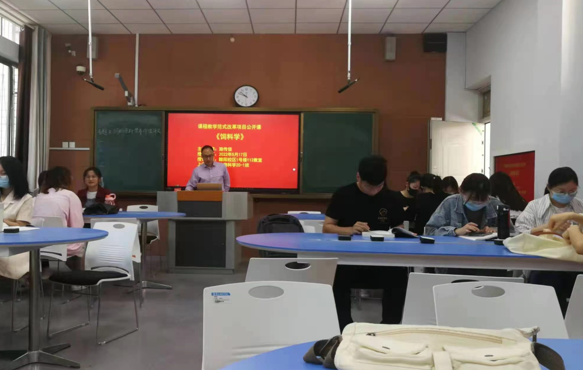 5月17日上午第三节,beats365中文官网施传信老师主讲的《饲料学》课程范式改革公开课在睢阳校区1号教学楼112教室举行,公开课以线上线下相结合的方式进行。beats365中文官网副经理宋兆齐、教学督导员马原松、生物工程系主任宋丹丹和生命健康产业公司技术中心主任李志强及部分老师现场观摩。