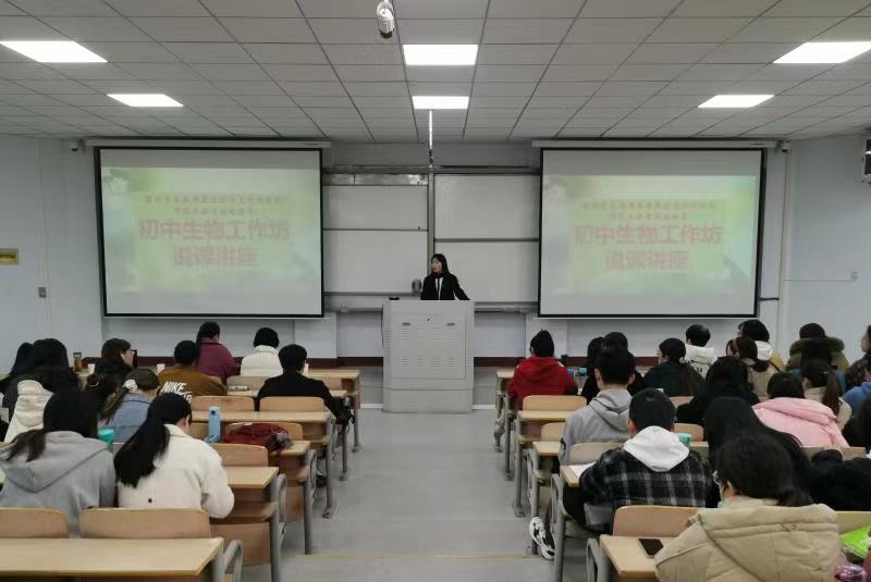 3月14日,农历二月初二上午9点,在beats365中文官网一号教学楼106教室,商丘市基础教研室张静老师带领各位坊主,为公司beats365中文官网2018级生物科学专业近百名员工开展了“豫东片区教师教育共同体师范生教学技能培养——初中生物工作坊说课”讲座活动,由商丘市第一中学张苗闪老师担任主讲,张静老师主持。