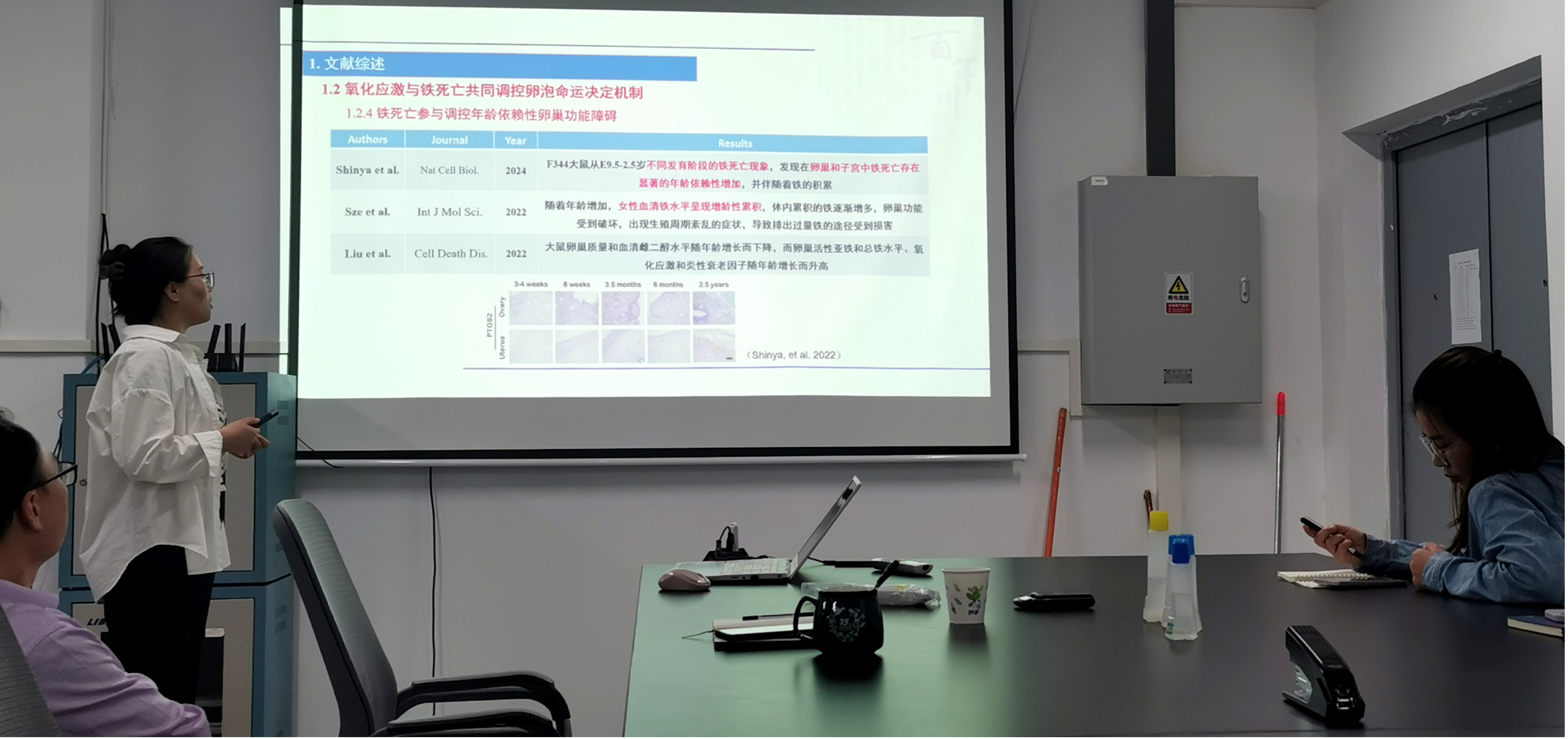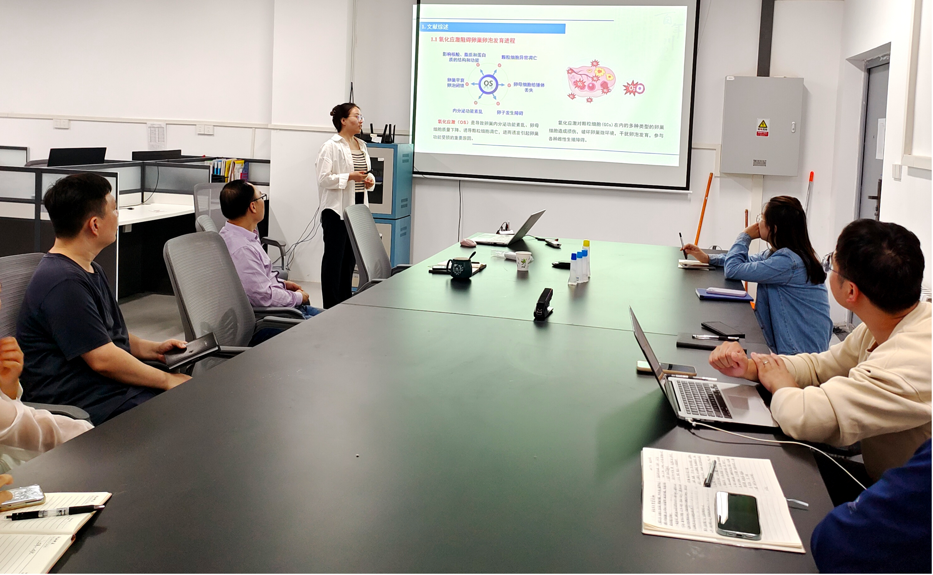报告中,牛春阳博士围绕亚精胺抗卵巢和颗粒细胞氧化应激和铁死亡展开,通过建立小鼠卵巢及猪卵泡颗粒细胞氧化应激和铁死亡模型,评估了卵巢卵泡数量,血清雌二醇、孕酮水平,抗氧化酶活性,以及氧化应激、自噬和铁死亡关键蛋白表达。结合蛋白质组学测序探究亚精胺介导胱氨酸/谷氨酸转运体抗颗粒细胞铁死亡的作用机制,为揭示亚精胺改善哺乳动物卵泡发育的分子机制提供理论依据。互动环节,大家就“线粒体结构及铁死亡典型特征”“实验动物的选择”等问题进行了深入交流,并给出了一些中肯建议,现场学术氛围浓厚。