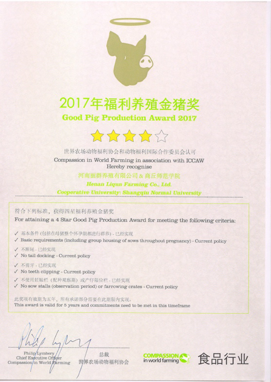 图7 第十二届世界农场动物福利奖金猪奖证书