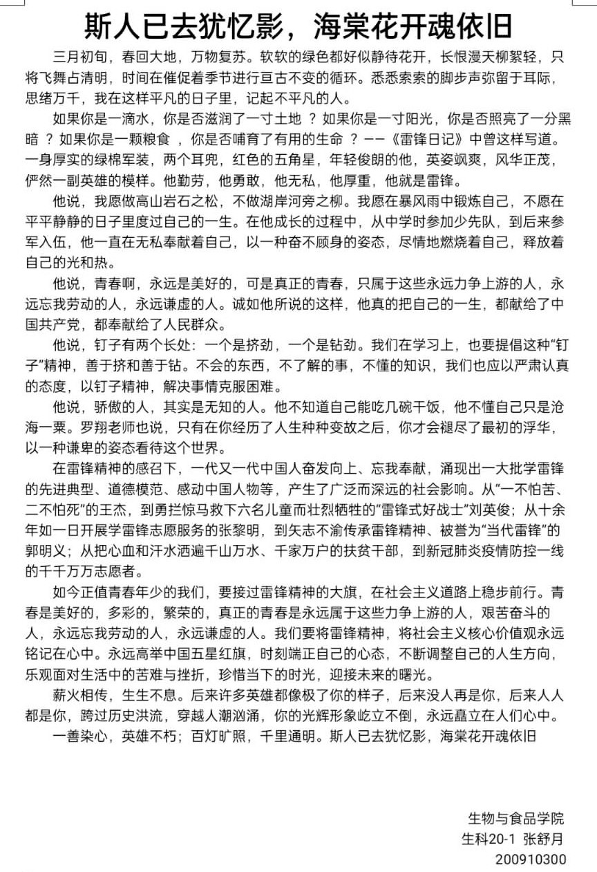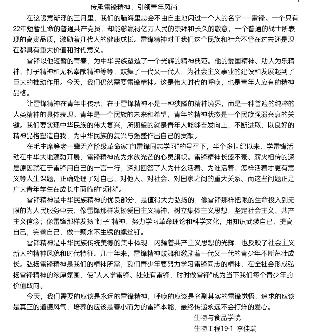 为进一步弘扬“雷锋精神”,不断完善和发展雷锋精神的内涵,落实“安全文明卫生月”工作,倡导助人为乐,无私奉献的精神,营造良好的学习、生活氛围。beats365中文官网团委员工会学习部于3月4日举办以“传承雷锋精神,引领青年风尚”为主题的线上征文活动。
