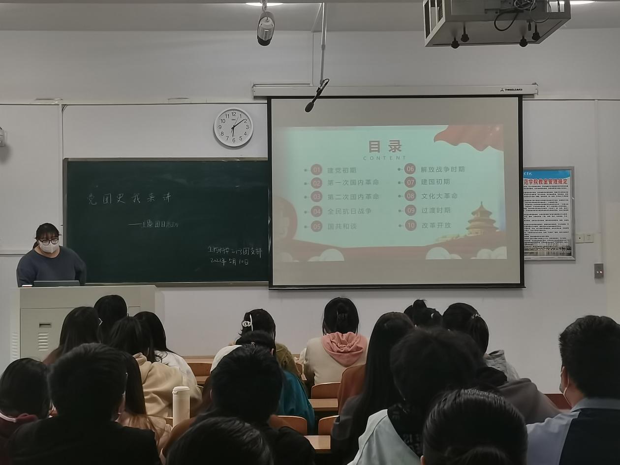 在观看完ppt后,同学们积极发言,说出自己对党史的学习见解。同学们也表示自己作为青年团员,会更坚定的投身于劳动实践中,将所学知识应用到社会实践中去,为祖国添砖加瓦。最后,团支书王甜甜对本次团日活动进行了总结,并鼓励同学们积极参加社团活动,投身于劳动实践。