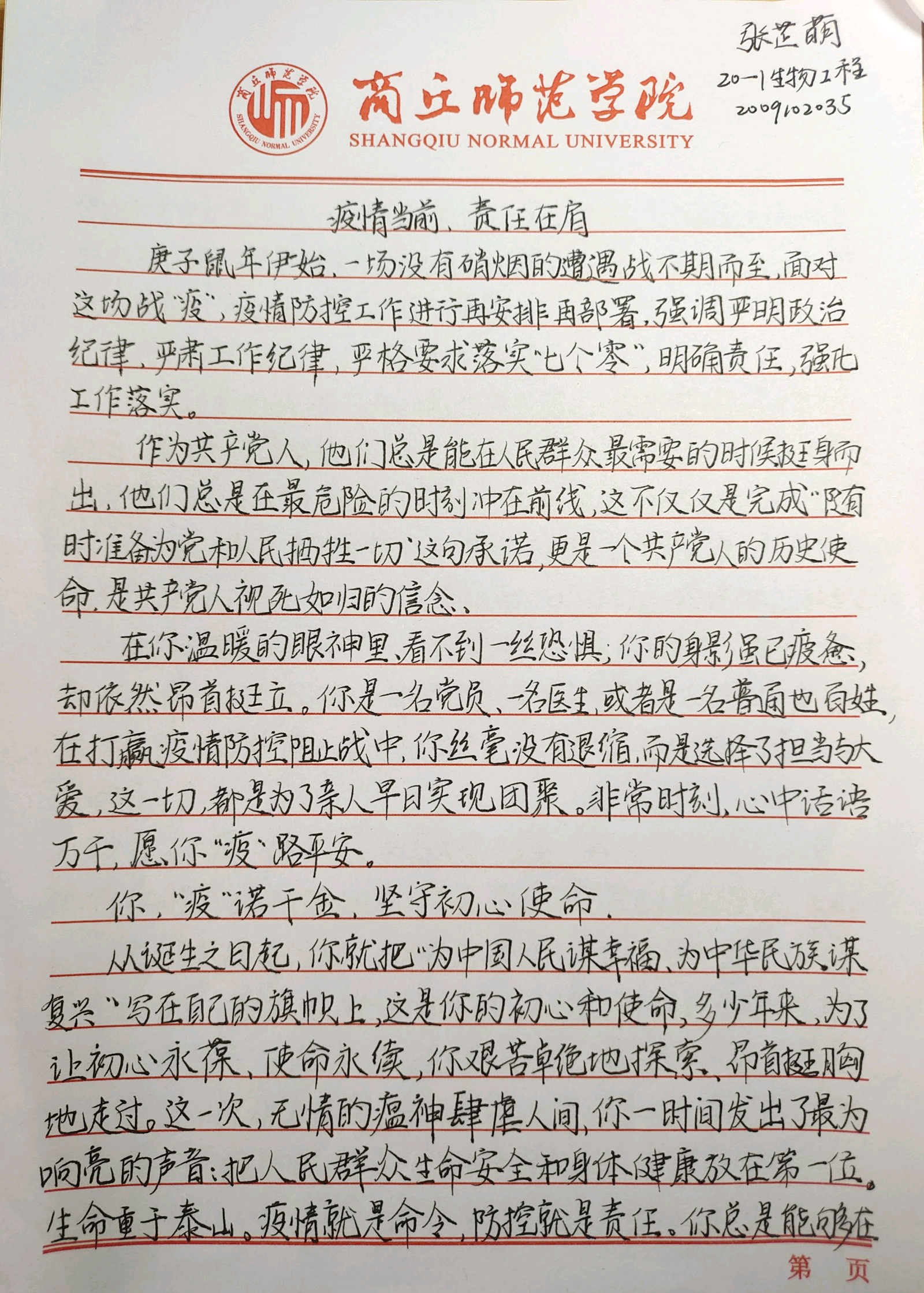 活动开始前,宣传部发布说说宣传活动,办公室创建活动群聊,通知各班班长鼓励同学们积极参加。活动开始后,同学们踊跃参与,书写出自己对抗疫英雄的敬佩以及对逆行者们的赞美,写作完成后,交给本班班长,再由工作人员统一收集。作品收齐后,评委团经过认真地选拔,将作品评出一等奖5名,二等奖10名,三等奖12名,并为获奖同学发放奖状。