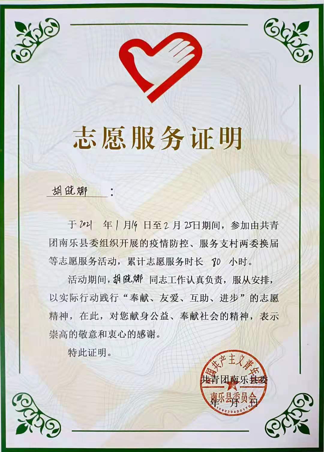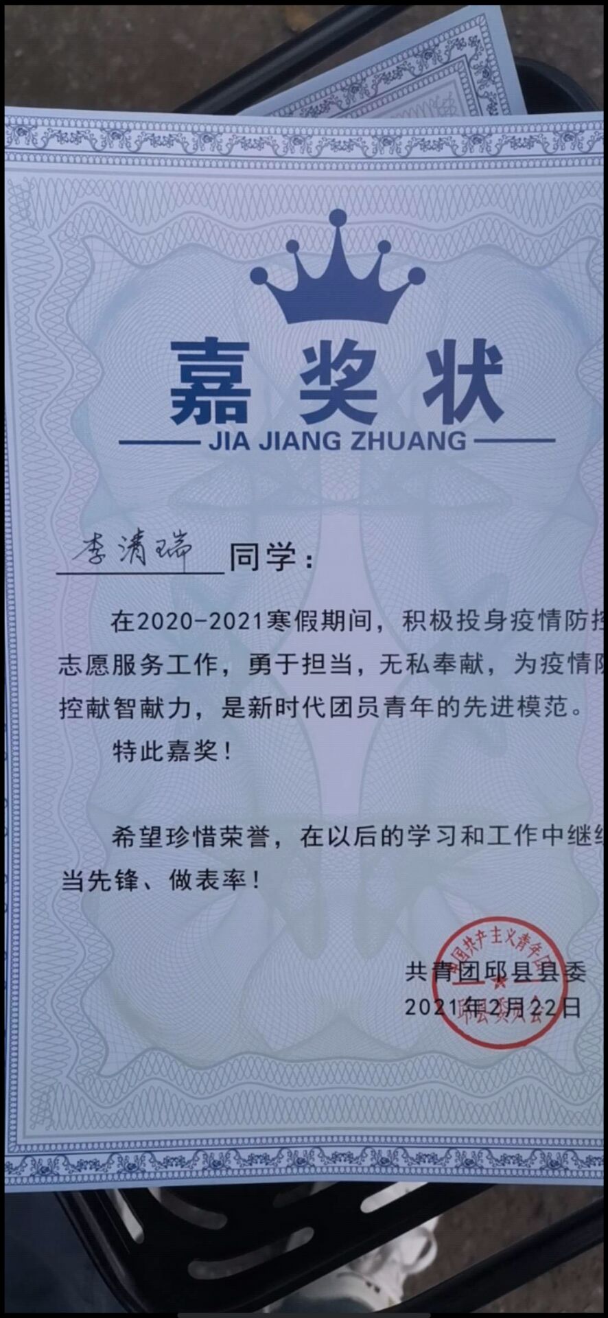 志愿工作刚开始的几天里,根据工作要求在村口值班设岗,对过往人员测量体温,并查看健康码,严格按照要求控制车辆及人员的出入,并做好记录。空暇之余,与小伙伴们一起对村里街道进行喷杀消毒;挨家挨户进行居家人口统计,询问是否有外来返乡人员并向其介绍一些基本的防疫政策与措施;遇上上了年纪的老人会帮他们清理庭院,耐心的提醒他们做好防疫措施,最终获得了共青团邱县县委的嘉奖令。