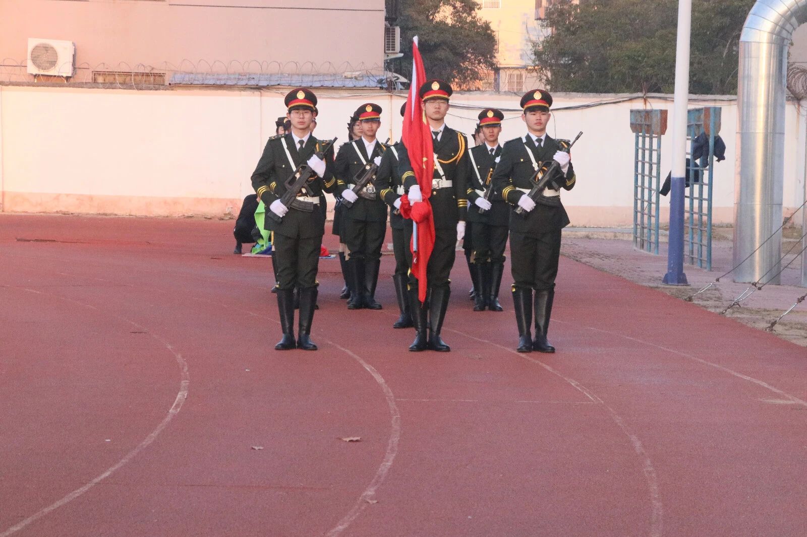 国旗护卫队迈着铿锵有力的步伐,护送鲜艳的五星红旗走向升旗台。伴随着雄壮的《义勇军进行曲》,全体师生肃立行注目礼,齐唱国歌,凝视国旗冉冉升起。
