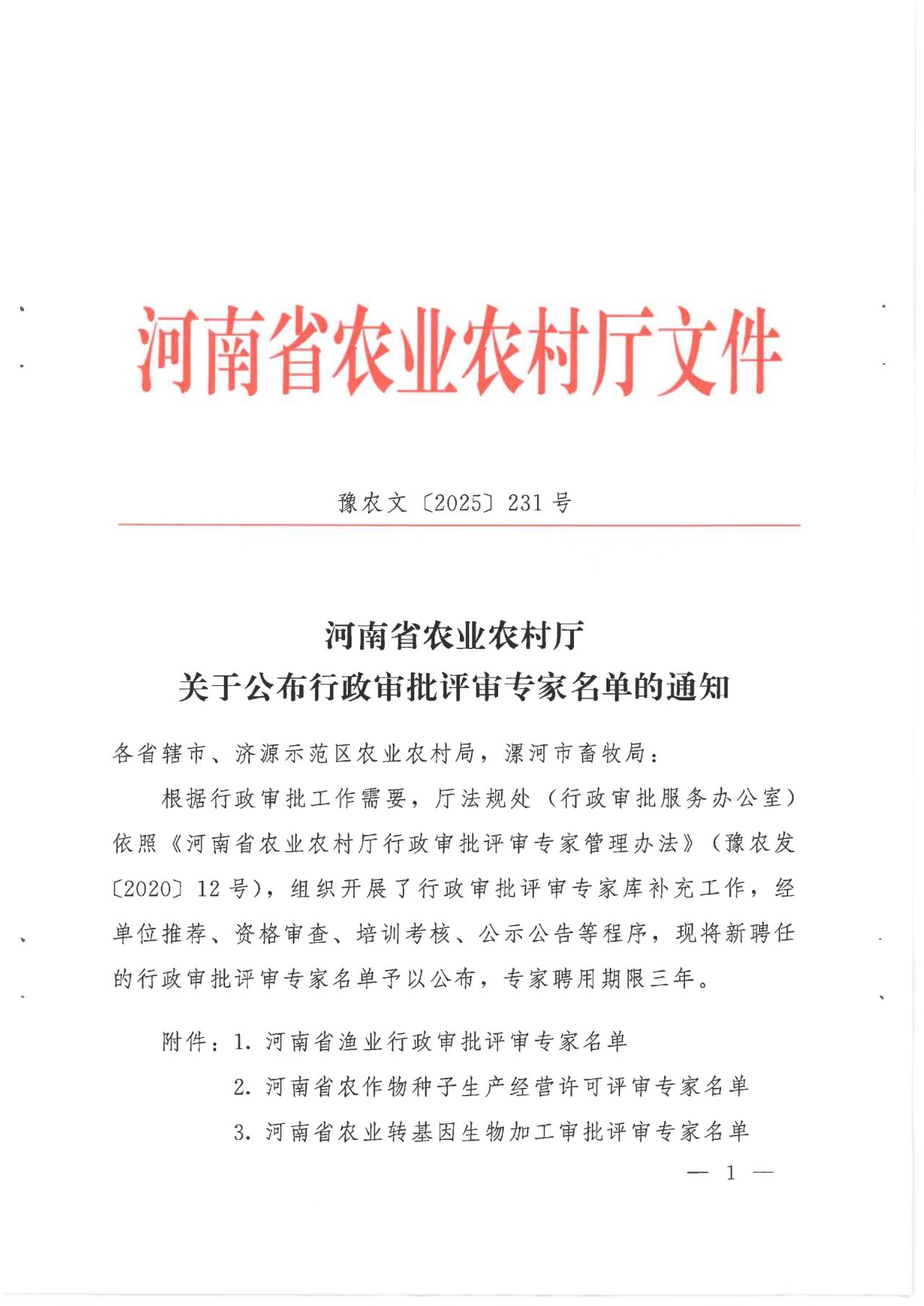 近日,河南省农业农村厅下发了《关于公布行政审批评审专家名单的通知》(豫农文2025-231号),公司施传信老师成功入选。