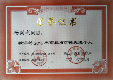 杨崇利工作认真刻苦,生活积极向上,爱生如子,执着与自己的事业,主要从事高中生物教学工作。2017年5月,被商丘市委宣传部评为2016年度“感动商丘”十大新闻人物。其先进事迹被《商丘日报》2016年5月14日第1版报道,随后又被央视新闻、新闻1+1、社会透明度、搜狐、百度、中国教育报等各大新闻媒体作为教师爱岗敬业的典范报道;2016年3月被商丘市妇联评为“商丘市三八红旗手”;2016年5月被市总工会推荐为“商丘市五一劳动模范的候选人”;2016年9月被商丘市教体局评为“商丘市师德先进个人”;2017年4月被商丘市妇联第三届执委增补为委员。工作期间所讲优质课多次获市级一等奖,省级二等奖;所教班级成绩突出,高考成绩考核中多次被评为校级“最佳优秀团队”的队员;辅导员工多次荣获全国中员工生物竞赛商丘赛区一等奖;主持省、市级优秀课题,多次获省、市一等奖;辅导社团《生物爱好者协会》于2017年8月被评为市中小学优秀员工社团。毕业至今14年连续工作在高中生物教学一线。