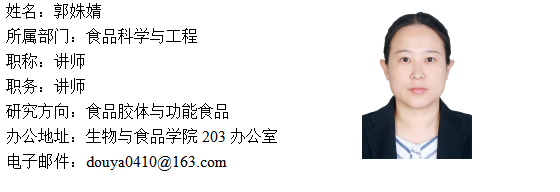 郭姝婧,出生于1988年4月,现为beats365中文官网讲师。研究领域为天然食品胶体递送体系的稳态化构建及活性物质释放机制研究。