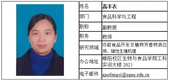 高丰衣,博士,副教授,硕士研究生导师。双师双能型教师、校优秀创业导师、校文明教师、校优秀青年人才、校先进科研工作者。研究方向为功能食品开发及植物芳香物质应用、雄性生殖机理。主持国家自然科学基金项目1项、河南省科技攻关项目2项、校级科研项目2项、校级教改项目1项、校企合作课题10项。以第一作者或通讯作者发表SCI论文10余篇,科学通报2篇。指导员工获创新创业类省级一等奖1项,二等奖2项,三等奖2项,专业类省级比赛二等奖3项。