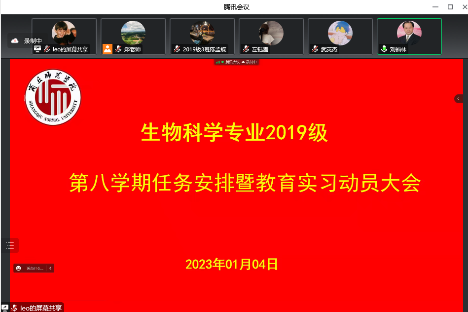 2022.1.4晚上7点,生物科学系召开了生物科学专业2019级班级会议,对第八学期的学习任务提前做了部署。参会的有刘福林教授、马丽系副主任、班主任及生物科学专业2019级全体员工。会议由系主任郑爱珍主持。