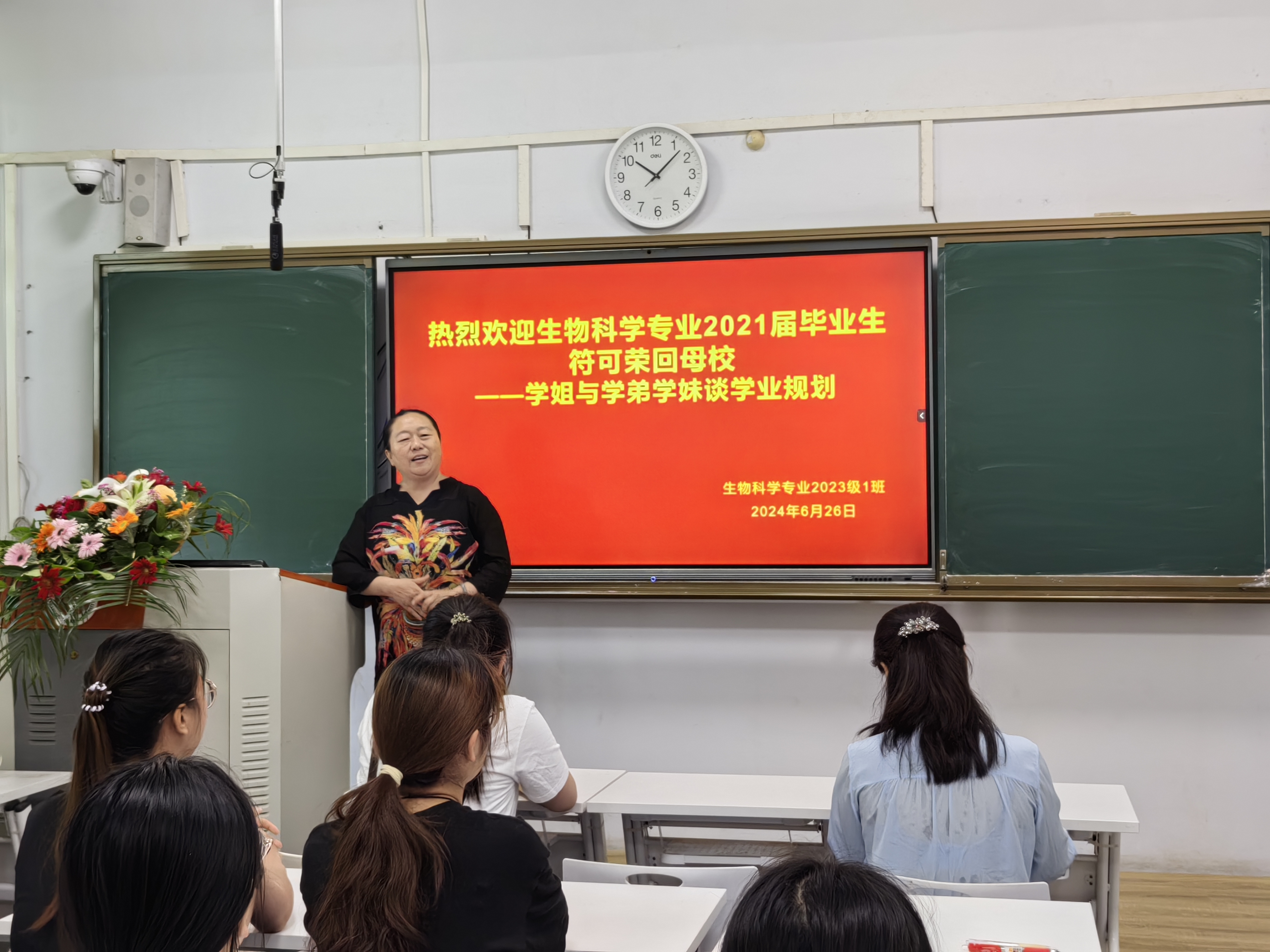 6月26日,生物科学专业2021届毕业生符可荣归母校,与学弟学妹们分享学业经验。生物科学系主任郑爱珍参加本次会议,生物科学23-1班班主任徐亚军组织指导,生物科学23-1班同学积极参与。