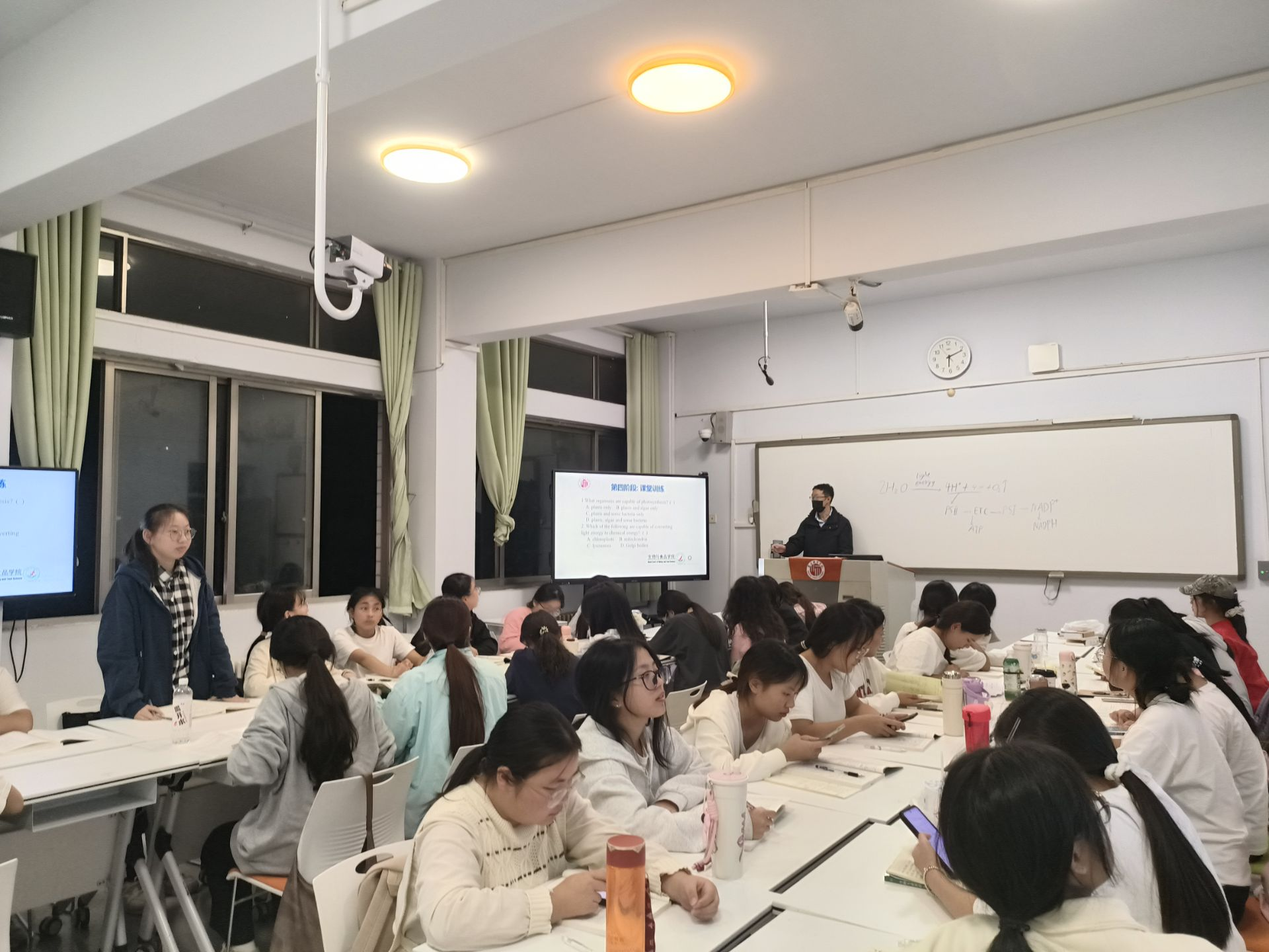 本次公开课讲授的是“光合作用过程与机理”。教学过程为:线上知识复习巩固-员工提问与老师答疑-英译汉翻译材料案例讨论-课堂训练-教师点评-结束新课布置作业。首先复习线上知识点,让员工了解光合作用英文相关专业词汇,以及大学英语考试常考词汇和语法知识点;然后由员工对相关难点内容提问,老师进行答疑,接下来以小组形式进行师生互动交流,由各学习小组讨论阅读材料英译汉翻译技巧以及译文质量,由老师进行指导;通过互动交流环节,加深了员工对生物学基础知识的理解,又提高了员工的英语词汇量和生物专业英文文献阅读能力, 最后结束新课,并按照OBE理念和生物科学专业人才培养目标布置课后作业。